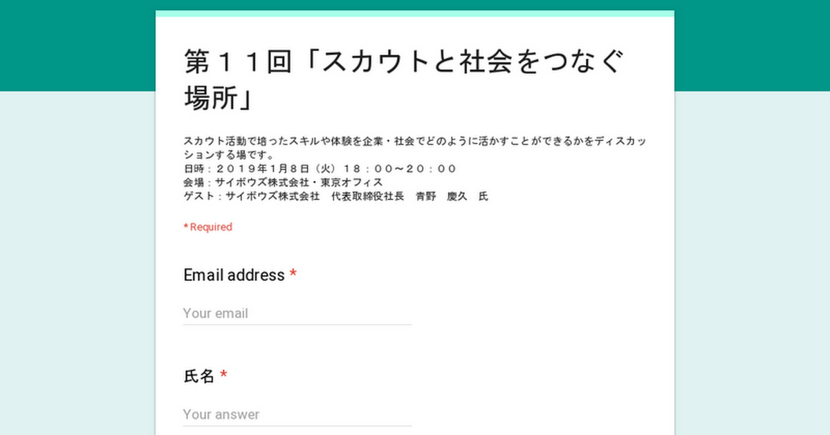 スカウト活動で培ったスキルや体験を企業・社会でどのように活かすことができるかをディスカッションする場です。日時:2019年1月8日(火)18:00~20:00会場:サイボウズ株式会社・東京オフィスゲスト:サイボウズ株式会社 代表取締役社長 ......
