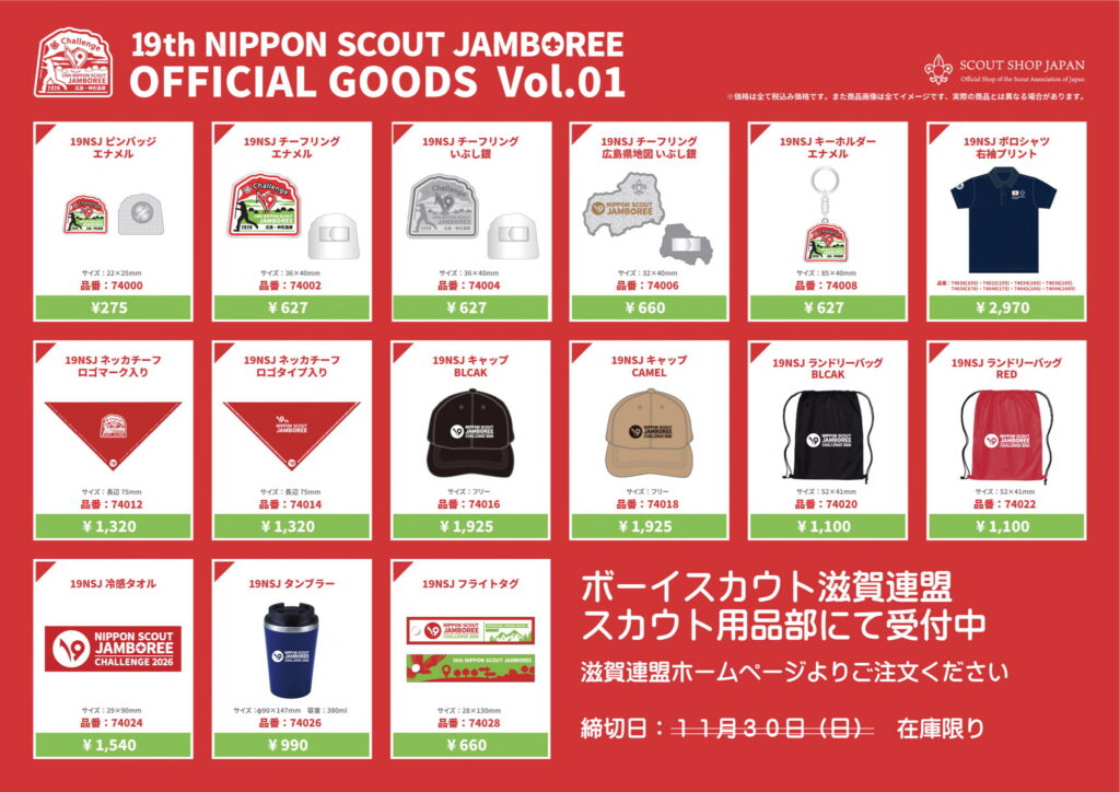 来年8月に広島県神石高原町で開催される第19回日本スカウトジャンボリー オフィシャルグッズの予約注文の第1弾を開始。「受注生産品」ですので県連締切りは11月30日(日)までとし、確実な入手を希望される場合はこの日までにお申込みいただいておりました。