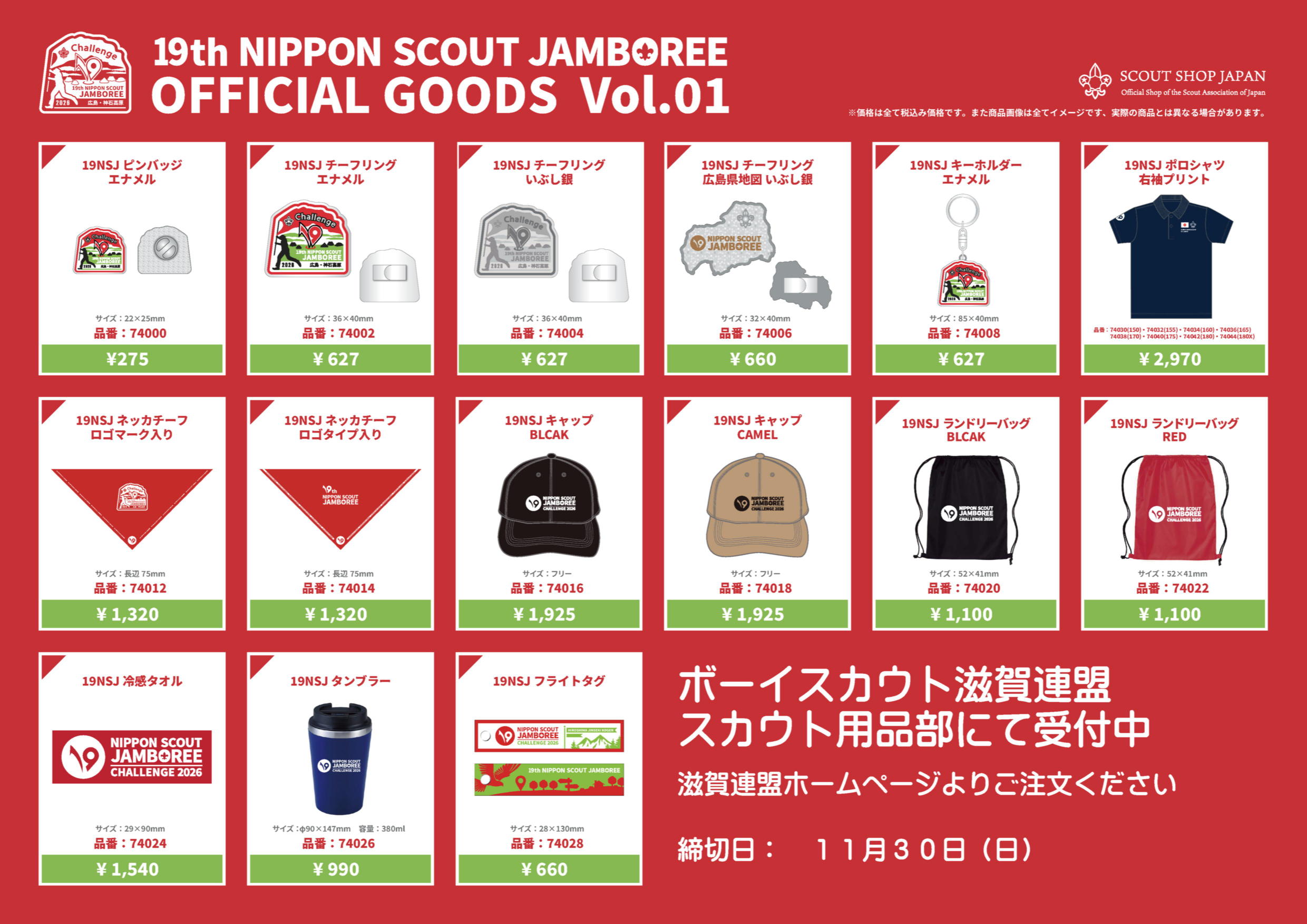 来年8月に広島県神石高原町で開催される第19回日本スカウトジャンボリー オフィシャルグッズの予約注文の第1弾を開始いたしました。「受注生産品」ですので県連締切りは11月30日(日)までといたします。確実な入手を希望される場合はこの日までにお申込みください。